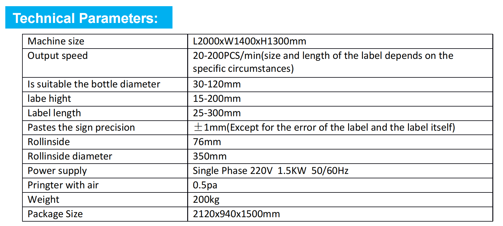 Automatic vertical labeling machine for glass bottles, plastic bottles and other cylindrical objects, tapered objects can be customized,but also according to product needs to increase the printer; the machine design is simple, lightweight, beautiful; can be used independently or with the pipeline Use of conjoined.