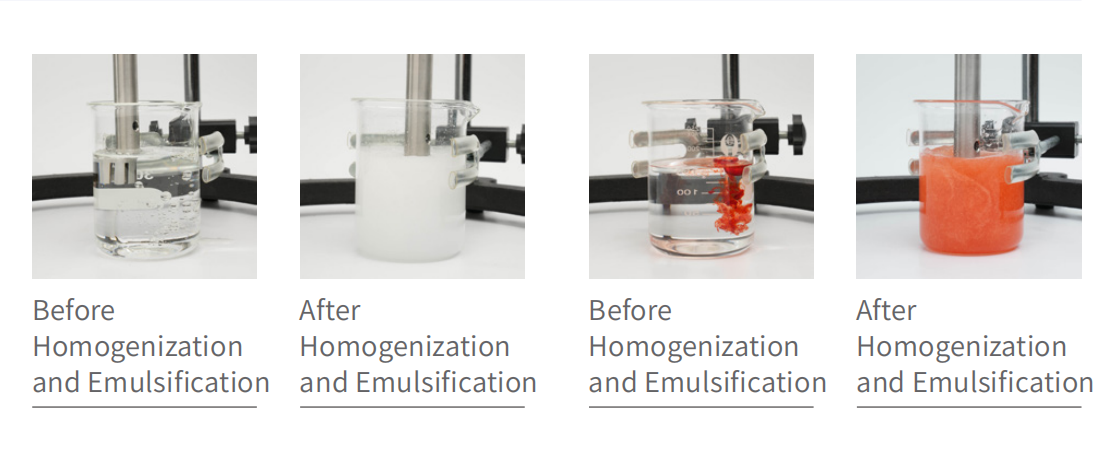 The high-speed homogenizing emulsifier uses an internal suction structure, providing high speed and efficient homogenization and emulsification of immiscible liquids.