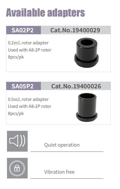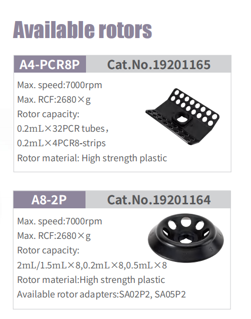 | Rotor Capacity | 0.2/0.5/1.5/2mL×8 0.2mL×32PCR tubes 0.2mL×4PCR8-strips |