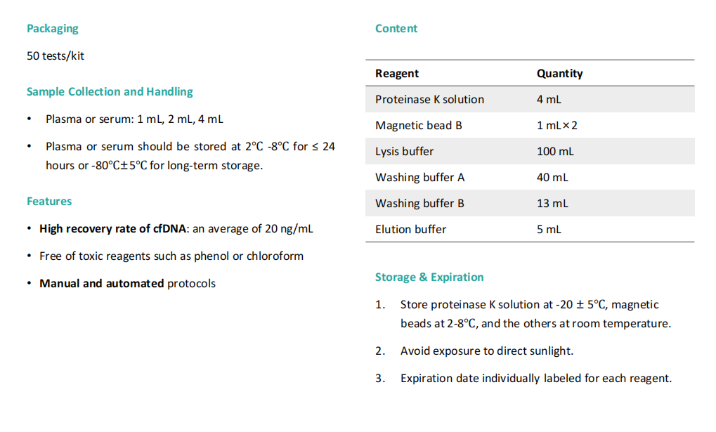 This kit purifies cell-free DNA (cfDNA) from plasma or serum. A volume of 1 mL, 2 mL or 4 mL is required for a single extraction.Purified DNA is suitable for next-generation sequencing (NGS), qPCR and DNA microarray analyses.