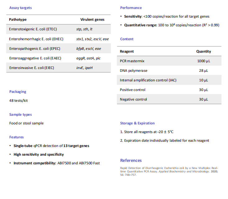 DEC Sensor® kit enables rapid detection of diarrheagenic E. coli (DEC) by a single-tube multiplex real-time quantitative PCR assay.It can simultaneously detect 13 virulence genes of five major DEC pathotypes along with a spiked-in internal amplification control (IAC) in a single tube.