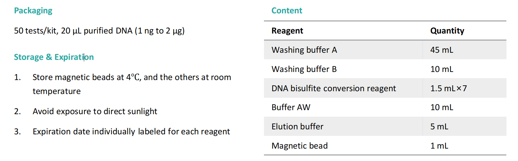 This kit is designed for bisulfite conversion, extraction, enrichment, and purification of nucleic acids. Bisulfite conversion step requires only 10 minutes, significantly reducing sample processing time while achieving >99.9% conversion efficiency. The processed DNA is suitable for downstream molecular analyses including next-generation sequencing, quantitative PCR, and DNA microarray applications.