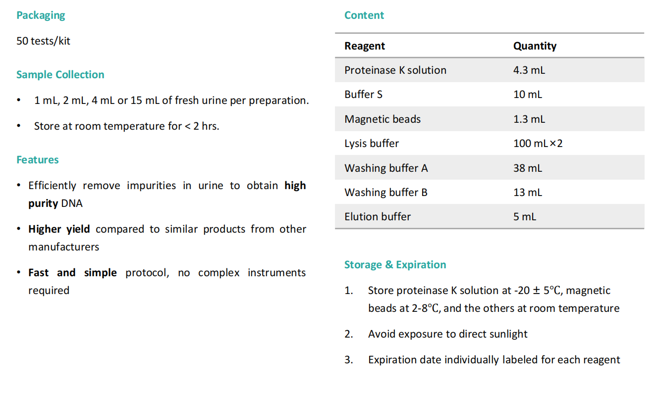 This kit purifies cfDNA from whole urine or urine supernatant. Purified DNA can be used for next-generation sequencing (NGS), qPCR and DNA microarray analyses. For long-term storage of urine, 10× urine preservation solution (Cat. No.: VRUPS) can be added