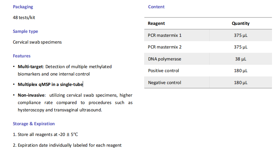 Endometrial cancer, the most common type of uterine corpus cancer, originates in the inner lining (endometrium) of the uterus and primarily affects postmenopausal women. This kit detects multiple DNA methylation biomarkers in plasma circulating cellm free DNA by a real-time quantitative PCR assay to assess the risk of endometrial cancers with high sensitivity, high specificity and cost-effectiveness.