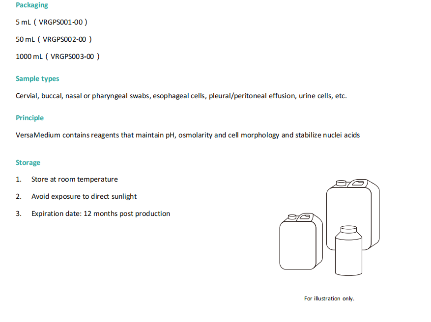 VersaMedium® liquid-based cytology (LBC) medium preserves the morphology of exfoliated cells and its intracellular nucleic acids with comparable performance to ThinPrep PreservCyt LBC medium. Preserved cells can be used for cell morphology and molecular biology tests.